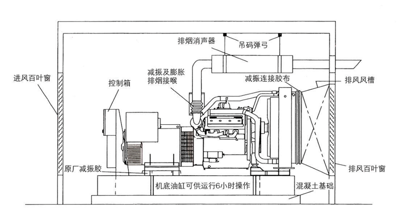 2、柴油發(fā)電機組應安裝在平整的混凝土地面上,同時確保機房通風散熱效果良好;