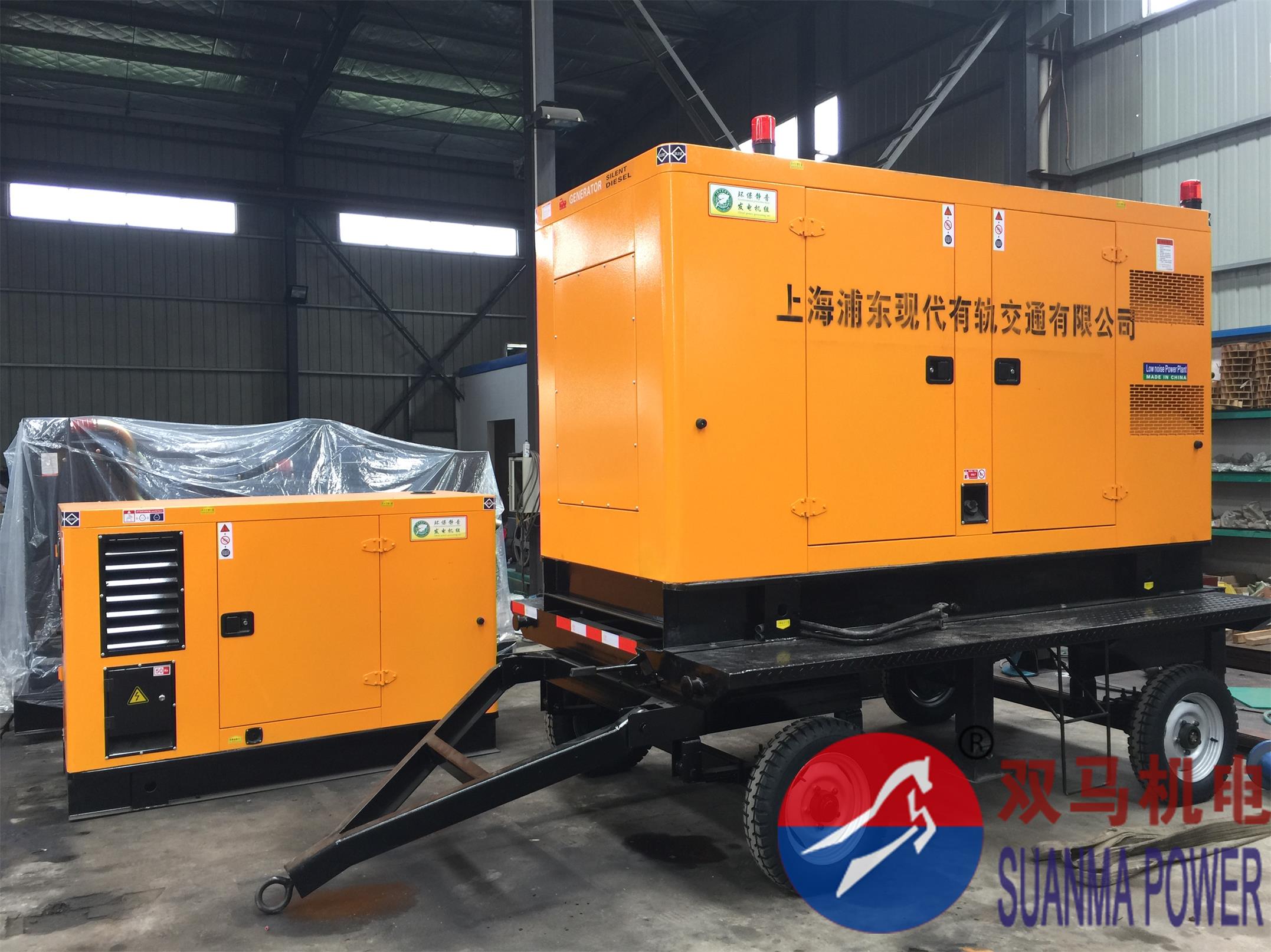 上海浦東現代有軌交通公司經過多家考察比對,最終選擇江蘇雙馬公司訂購了移動靜音發電機1臺作為試驗,機組采用上柴發動機配江蘇雙馬無刷電機,帶4輪移動底盤,靜" />